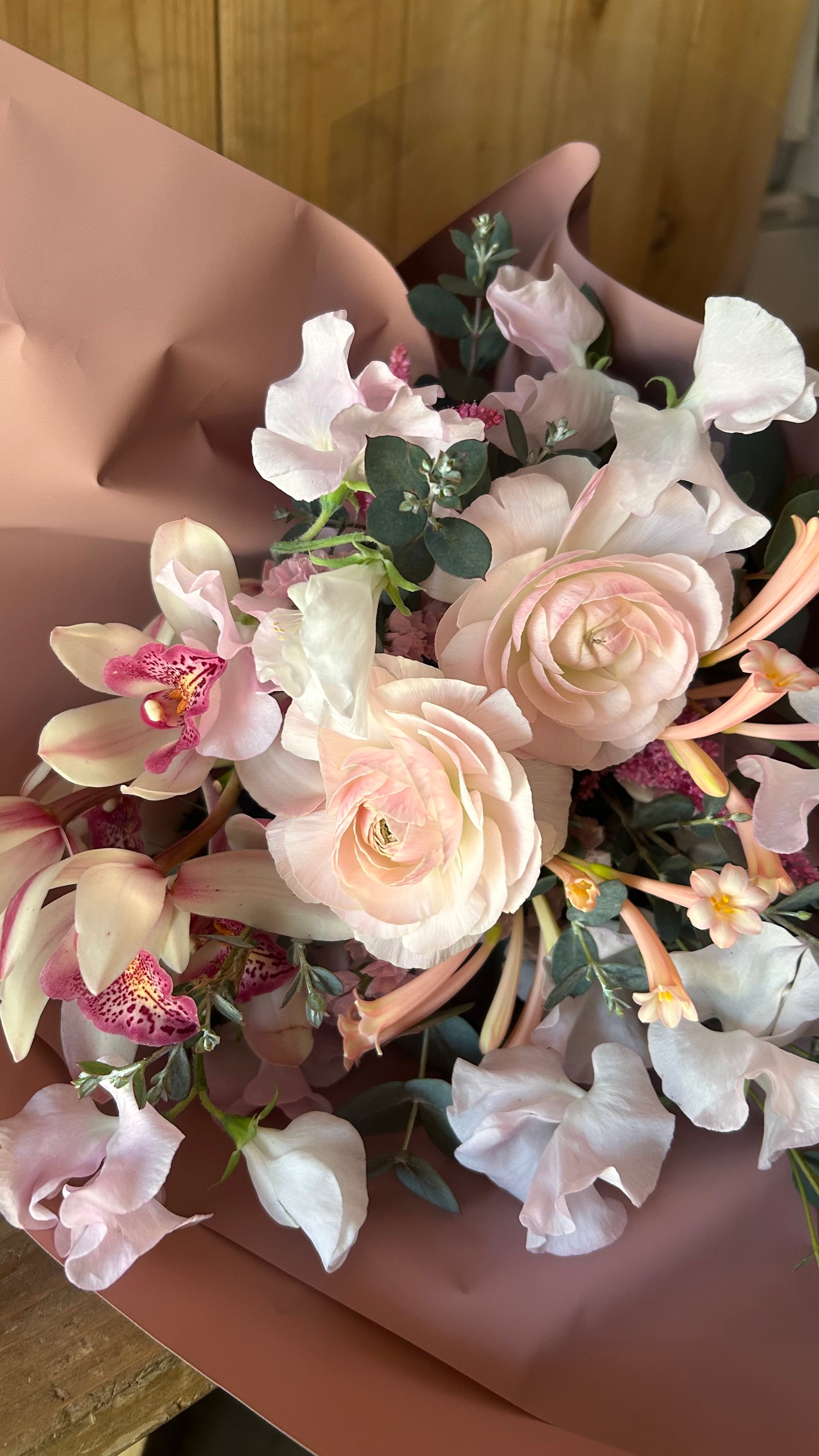 色んな咲き方のラナンキュラスを合わせたブーケ ふわふわなピンクが可愛い